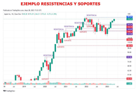 Gráfico en velas mensuales y escala logarítmica que permite el cálculo de Resistencia, Soporte, Rendimiento, Stop Loss y número de acciones a comprar.
